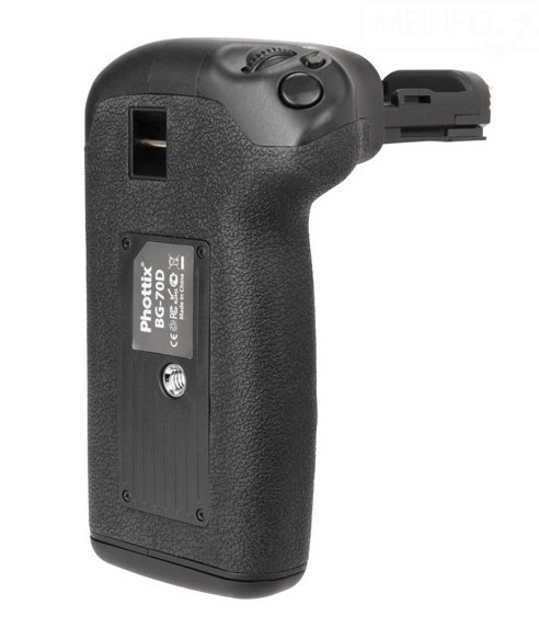 Многофункциональная аккумуляторная ручка Phottix BG-70D предназначена для цифровых фотоаппаратов Canon 70D. В качестве источника питания блока используются шесть стандартных батарей типа АА или две специальные аккумуляторные батареи LP-E6 (источники питания в комплект не входят, приобретаются отдельно). Использование рукоятки повышает скорость съёмки и увеличивает время автономной работы. Эргономичная конструкция рукоятки позволяет более удобно держать фотокамеру при съёмке в вертикальном положении. Для удобства съёмки вертикальных кадров, на рукоятке расположены дополнительная спусковая кнопка затвора, кнопка АЕ lock/FE lock, кнопка включения автофокуса, а также кнопка управления.