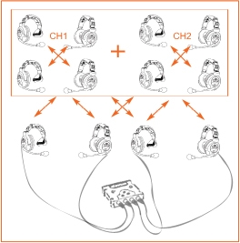Гибридная интерком-система, работает как с проводными гарнитурами, так и с беспроводными абонентскими блоками. Поддерживает подключение до 12 пользователей (8 беспроводных каналов + 4 канала проводной связи). Работа в автономной режиме (до 6 часов) или от сети.