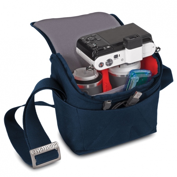 Небольшая плечевая сумка рассчитана на беззеркальные камеры со съемным объективом, дополнительный объектив. Есть небольшие карманы для личных вещей и небольших аксессуаров.
