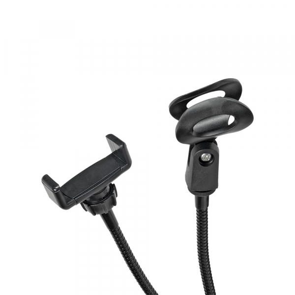 Для установки смартфона в комплекте предусмотрен адаптер. В него можно установить смартфон шириной от 58 мм до 73 мм. Смартфон надёжно фиксируется подпружиненной лапкой адаптера. При помощи цангового зажима адаптер устанавливается на гибкую штангу с шаром (Dшара = 17.5 мм). Высота штанги 38 см. Таким образом, для съёмки камеру смартфона можно установить практически в любом положении.