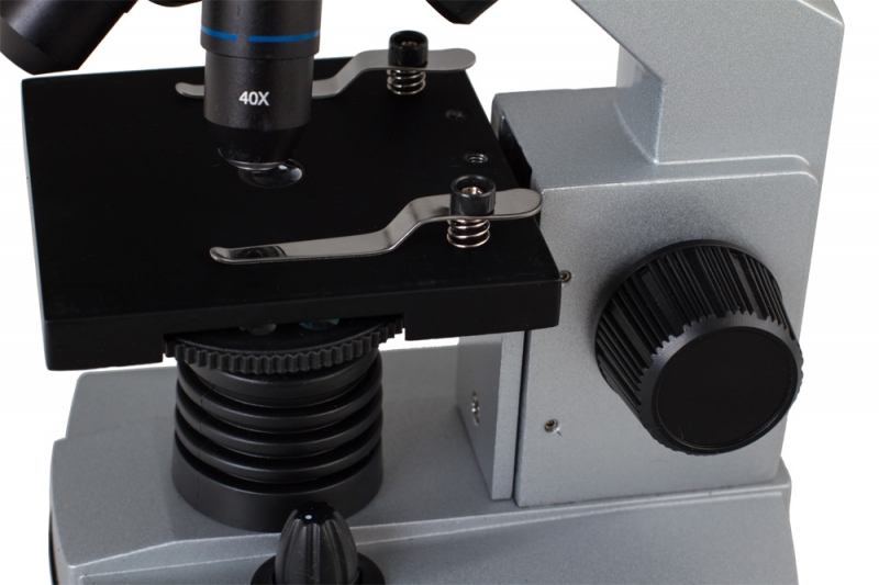Микроскоп снабжен двумя светодиодными осветителями регулируемой яркости, которые могут быть включены как одновременно, так и по отдельности. Благодаря возможности регулировать яркость осветителей можно подобрать оптимальную освещенность для каждого микропрепарата. Питание осветителей может производиться как от батареек, так и от электросети переменного тока (адаптер в комплекте).