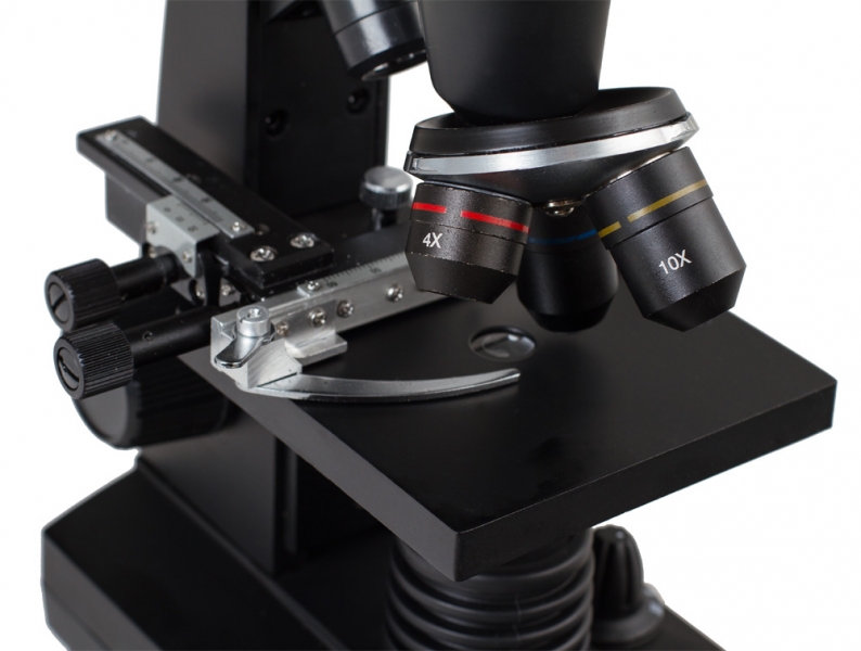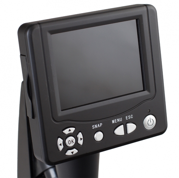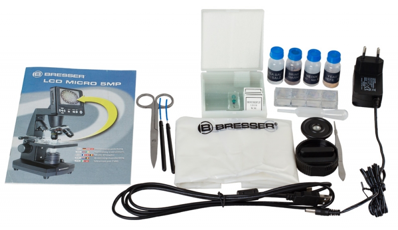 Изображение выводится на цветной ЖК-дисплей с диагональю 3,5", благодаря чему микроскоп удобно использовать при групповых работах. Кроме того, увеличенное изображение микропрепарата можно сохранить в формате JPEG. Также имеется возможность записи видео в формате 3gp. На боковой стороне дисплея имеется слот для карт формата SD. Предметный столик с нониусом и препаратоводителем позволяет перемещать изучаемый объект, не прикасаясь к нему руками. Подсветка осуществляется с помощью светодиодов. Нижняя подсветка используется для изучения прозрачных объектов, а верхняя предназначена для исследования непрозрачных объектов в отраженном свете. Под предметным столиком расположен диск с 6 светофильтрами. Микроскоп Bresser LCD 50x-2000x имеет богатую комплектацию, что делает его незаменимым для начинающих биологов. В комплект входят не только необходимые для работы аксессуары, но и набор готовых микропрепаратов.