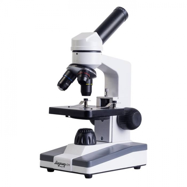 Тем не менее, благодаря компактным размерам и демократичной цене, Микромед С-11 охотно используют на школьных уроках биологии и в домашних детских исследованиях. Применительно к домашним исследованиям преимущества С-11 очевидны. Во-первых, качество картинки и удобство наблюдения. На всех увеличениях картинка яркая (благодаря мощному светодиоду) без окрашенности по краям, четкая и резкая. Во-вторых, удобство использования. Питание — от 3х батареек АА (входят в комплект) или через адаптер от сети 220В. Насадка с окуляром — поворотная, на 180˚. Ограничительный винт не позволит объективу при настройке на резкость упереться в препарат и повредить его, да и самому повредиться. Усилие прижатия клеммами препарата можно заранее подрегулировать «под себя». Это удобство оцениваешь, когда, глядя в окуляр, «наощупь» пытаешься подвести нужный участок препарата под объектив. Т. к. все посадочные размеры выполнены в соответствии с принятыми в микроскопии стандартами, Микромед С-11 легко «апгрейдить». Можно дополнительно приобрести видеоокуляр — для передачи картинки на ПК, к нему подходит оптика от микроскопов с глубиной тубуса на 160 мм и т. д.