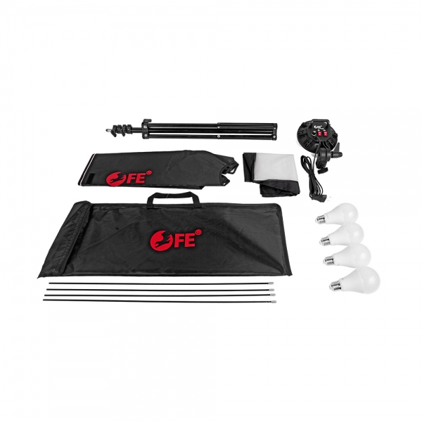 Корпус осветителя на 4 патрона стандарта Е27. На задней панели находятся два переключателя, каждый из которых управляет функцией включения/выключения для двух ламп, расположенных по периметру. Осветитель питается от сети 220 В и имеет стандартный разъем для установки на стойки с креплением 5/8". Осветитель можно использовать самостоятельно или вместе с софтбоксом 60х80 см из комплекта поставки.