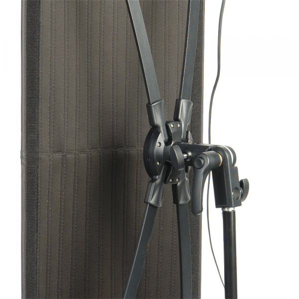 Для питания осветителя можно использовать батарею V-mount (приобретается отдельно) или сеть, подключая прибор через сетевой адаптер. В комплект входит складной держатель X-mount для легкой установки осветителя и сумка для переноски и хранения.