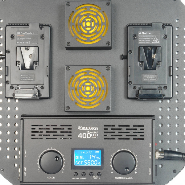 Мощный светодиодный осветитель GreenBean MoonLight 400 LED bi-color - круглая световая панель с изменяемой цветовой температурой. Источники света — 1280 ярких SMD светодиодов с высоким уровнем цветопередачи (CRI более 95). Максимальная мощность — 230 Вт. В отличие от традиционно используемых софтбоксов, осветитель GreenBean MoonLight имеет абсолютно круглую матовую (через которую не видны излучающие светодиоды) поверхность, малые габариты и может создавать красивые круглые блики на глянцевых отражающих поверхностях. В осветителе используется две группы светодиодов с температурой 3200 К и 5600 К, каждая номинальной мощностью 200 Вт. Электрическая схема блока питания осветителя ограничивает общую мощность световой панели величиной 200 Вт. Установив (зафиксировав) необходимую мощность панели (максимум 200 Вт), пользователь может плавно менять цветовую температуру без изменения настроек камеры. Регулировка мощности бесступенчатая — от 10 до 100%