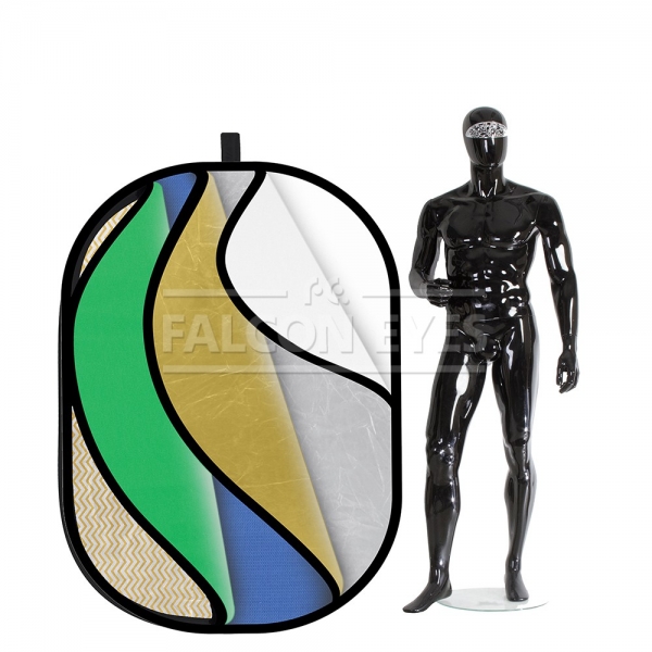 Овальный отражатель 7 в 1: золотистый/серебристый/белый отражающий/ белый просвечивающий/серебристые и золотистые полоски/зеленый/синий. Рабочий размер 100х165 см. Используется в предметной и портретной съемке, а также для подсветки участков кадра. Конструкция состоит из пружинного стального обруча с натянутой на него полупрозрачной рассеивающей тканью и чехла на молнии со светоформирующими поверхностями. Золотистая поверхность придает отраженному свету золотистые тона, добавляет теплого света в сцену. Серебристая поверхность используется для получения жесткого света, что позволяет получать контрастное изображение с четкими тенями. Высокий коэффициент отражения делает эту поверхность одной из часто используемых, найдет применение даже в пасмурную погоду. Белая отражающая поверхность позволяет получить равномерный и мягкий световой поток для подсветки теней и выравнивания светотеневого рисунка, используется как заполняющий источник. Не искажает цветовую температуру источника освещения. Просвечивающая ткань рассеивает проходящий сквозь нее световой поток от вспышки и равномерно освещает объект съемки увеличенной площадью излучения. Таким образом, резкий точечный свет, излучаемый при срабатывании фотовспышки, преобразуется в достаточно мягкий световой поток, излучаемый с большей площади. Золотисто-серебристые полоски модифицируют световой поток от источника в эффективный умеренно теплый и мягкий световой поток, перенаправляемый на объект съемки. Зеленый и синий применяются для съемки по технологии хромакей. Стальной упругий каркас прошит по периметру капроновым карманом, диаметр отражателя в сложенном виде – 43 см.