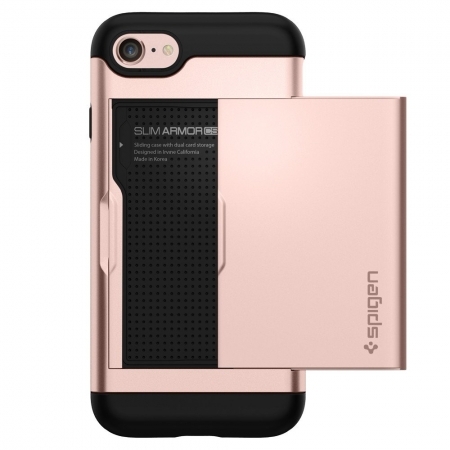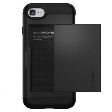 Для тех, кому надоело рыться в карманах, разыскивая то телефон, то бумажник, южнокорейская компания Spigen предлагает новый вариант противоударного чехла-накладки Slim Armor со слотом для двух кредитных карт. Слот прячется за внешней крышкой из высококачественного поликарбоната, которая в случае необходимости мягко сдвигается.