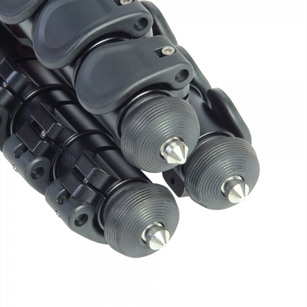 Нижние секции ног штатива оборудованы комбинированными наконечниками, позволяющими легко закрывать стальные нержавеющие шипы вывинчивающимися резиновыми опорами.