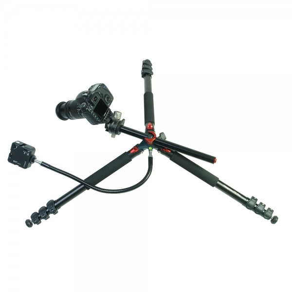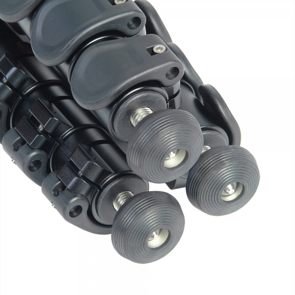 Благодаря 4-секционной конструкции, длина штатива в сложенном виде составляет всего 530 мм. Клипсовые зажимы с регулируемым усилием надежно и быстро фиксируют секции. Селекторы угла расстановки ног позволяют зафиксировать каждую ногу на любом из трех заданных углов независимо друг от друга, это обеспечивает большую гибкость для позиционирования камеры и дает возможность использовать в качестве опоры ступени, камни или другие сложные поверхности, а также проводить съемку с нижней точки.