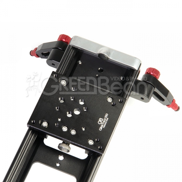 На каретке находятся 11 монтажных резьбовых отверстий 1/4" и 3 резьбовых отверстия диаметром 3/8", которые позволяют размещать на каретке аксессуары и вспомогательное оборудование. Центральное отверстие 3/8" без резьбы предусмотрено для крепления штативной головы (винт в комплекте). Большое количество монтажных отверстий обеспечивает универсальность установки и использования слайдера. Дополнительно можно приобрести базу с чашей GreenBean Video Base 100/75 для установки штативных голов с шаровым основанием.