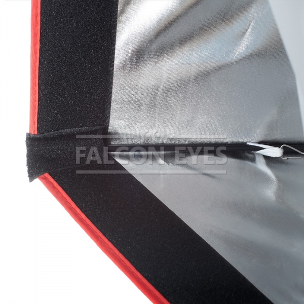 Установленный на приборе софтбокс можно поворачивать на 360 градусов, выбранное положение фиксируется винтом на адаптере. Внешний и внутренний рассеивающие экраны изготовлены из тонких жаропрочных синтетических материалов, крепятся на резинках-растяжках (внутренний) и на липучке (внешний). В комплекте с софтбоксом поставляется сотовая насадка. С помощью липучки (по всему периметру) соты крепятся к «козырьку» софтбокса. Соты применяется для формирования ограниченного и направленного светового потока с плавным светотеневым переходом от центра к краю светового пятна. Закрытая конструкция позволяет избежать нежелательных бликов и потерь светового потока. Отражатель, с серебристой тканью внутри, обеспечивает равномерную засветку рассеивателя, который в свою очередь, благодаря большой поверхности, смягчает формируемые тени. Дополнительный внутренний диффузор улучшает равномерность светового потока. Наконечники на упругих металлических спицах не повреждают тканевые спицедержатели софтбокса и облегчают сборку конструкции. В комплекте чехол.