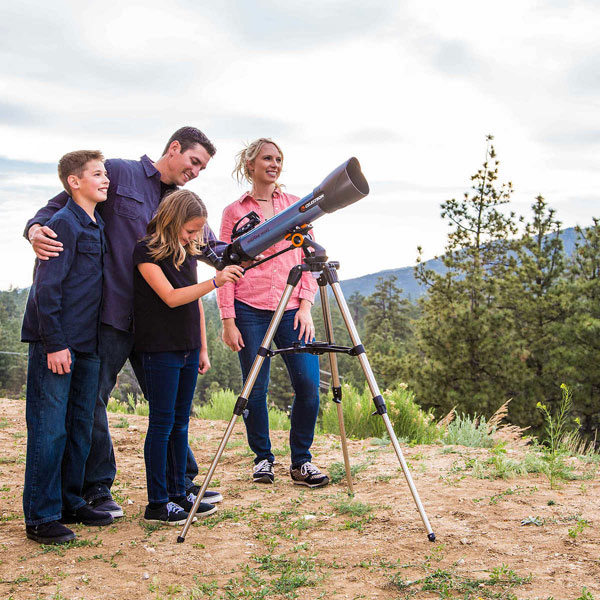 Телескоп Celestron Inspire 100AZ Inspire 100 AZ - это телескоп-рефрактор, который идеально подходит не только для астрономических наблюдений, но и для наблюдений за наземными объектами. С помощью телескопа Inspire100 AZ вы увидите планеты Солнечной системы, Луну, звездные скопления, яркие туманности и галактики. Такие как: Туманность Ориона и Туманность Андромеды. А с помощью оборачивающей призмы вы сможете использовать телескоп днем как мощную зрительную трубу. Подготовить телескоп к наблюдениям вы сможете в считанные минуты. Даже на первую сборку телескопа у вас уйдет минимальное время без использования дополнительных инструментов. А выдвижные ножки штатива позволят вам устанавливать телескоп не только на земле, но и даже на столе. Набор аксессуаров входящий в комплект поставки позволит вам сразу начать наблюдения. Азимутальная монтировка Азимутальная монтировка оснащена удобной ручкой с помощью, которой вы легко наведете телескоп на интересующий вас объект. Аксессуары В комплект поставки телескопа Inspire 80 AZ входит: два окуляра (20 и 10 мм), оборачивающая призма 90°, адаптер для смартфона встроенный в крышку объектива, видоискатель StarPointer Pro и красный светодиодный фонарик. С помощью двух окуляров вы сможете рассмотреть объект в телескоп с разными увеличениями. Оборачивающая призма 90° очень удобна для наблюдения за небесными объектами, которые находятся высоко над горизонтом, а также позволит вам наблюдать наземные объекты в прямом а не в перевернутом виде. Искатель StarPointer Pro очень удобен для наведения телескопа на интересующие вас объекты. Достаточно двигая трубу телескопа, совместить красную светящуюся точку видоискателя с предполагаемым объектом наблюдения, как этот объект попадет в поле зрения телескопа. Красный фонарик вам поможет осветить место вашего наблюдения, а также карты и свои записи, не испортив адаптацию ваших глаз к темноте. Адаптер для смартфона позволит вам сфотографировать небесные объекты, например кратеры на Луне или наземные объекты, такие например, как птиц и животных.
