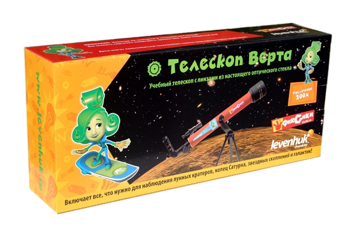 Телескоп Levenhuk Фиксики Верта – это превосходная модель, предназначенная для детей от 5 лет и старше. Прибор прост в обращении и интуитивно понятен даже новичкам, а его возможностей хватает, чтобы вести как наземные, так и астрономические наблюдения. Levenhuk Фиксики Верта – это рефрактор с ахроматическим объективом, снижающим влияние хроматизма. В комплекте имеется окуляр 20 мм, позволяющий вести наземные и астрономические наблюдения, а также окуляр 6 мм, обеспечивающий большее увеличение и прекрасно подходящий для ночных наблюдений. Для более удобного наблюдения околозенитных областей телескоп оснащен диагональным зеркалом. Помимо самого телескопа, в комплект входят компас для правильного ориентирования во время астрономических наблюдений, ростомер и набор из трех постеров Levenhuk Фиксики, посвященных космической тематике. Плакаты отпечатаны на плотной мелованной бумаге формата А1 (84х60 см) и будут прекрасно смотреться на стене детской комнаты. Кроме того, они очень информативны, так что их изучение будет интересно не только ребенку, но и взрослым.