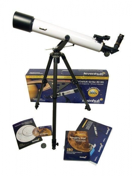 Старшая модель серии Levenhuk Strike 80 NG, которая отличается большими оптическими возможностями. Это рефрактор-ахромат на легкой азимутальной монтировке, который хорошо подойдет для начинающих любителей астрономии любого возраста. Благодаря не имеющей аналогов богатой комплектации, включающей все необходимое для проведения наблюдений, будет отличным подарком для любознательного подростка. В этот телескоп можно рассмотреть множество деталей на лунной поверхности (кратеры и другие детали поверхности крупнее 5 километров), кольца Сатурна, облачные пояса и спутники Юпитера, фазы Венеры, яркие кометы, туманности и галактики, множество двойных и кратных звезд, звездных скоплений и других интересных объектов.