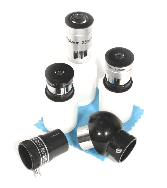 • Поставляется в комплекте с тремя сменными окулярами (5 мм, 10 мм и 25 мм), линзой Барлоу 3х, искателем 6х30