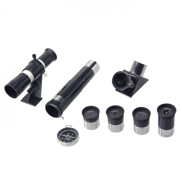 Что можно увидеть в этот телескоп: кратеры Луны диаметром ок. 10 км, Венеру, Марс, проникающая способность этого телескопа — вплоть до 12,0 зв.вел. Труба телескопа снабжена съемной солнечной блендой, которая не только защищает при дневных наблюдениях от паразитных засветок, но и благодаря своей глубине (90 мм), предохраняет от повреждений объектив. На выходе телескоп дает прямое (не перевернутое изображение) а высокое качество картинки, обеспечивается целым рядом технических «ньюансов», таких как: ахроматический объектив, хорошее чернение трубы изнутри — для устранения паразитных переотражений, окуляры Кёльнера (не самой простой конструкции) и.т.д. Искатель с 6х увеличением для быстрого наведения на цель, расположен под углом 45° к окуляру и не мешает при наблюдениях.