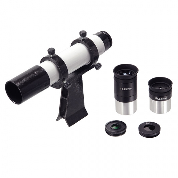 Очень стильное исполнение телескопа: белая глянцевая металлическая труба в обрамлении выглядящих брутально крышек, колец и деталей монтировки немецкого типа EQ5 с декоративными оранжевыми элементами. Удобный искатель (увеличение 6х) расположен рядом с окуляром. Мощный, красивый, устойчивый штатив из полированной нержавеющей стали с дополнительными распорками, на которые устанавливается полочка для аксессуаров.