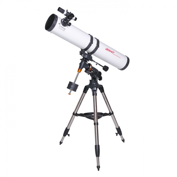 Модель для серьезных, но начинающих любителей астрономии. Зеркало диаметром 114 мм достаточно велико, чтобы собирать много света (в этот телескоп вы сможете увидеть объекты солнечной системы во всех подробностях — таких как щель Кассини в кольце Сатурна, лунные кратеры размером 5 км, неяркие звезды до 13 m звездной величины). Габариты прибора довольно внушительные, длина трубы 86 см. Очень стильное исполнение телескопа: белая глянцевая металлическая труба в обрамлении выглядящих брутально крышек, колец и деталей монтировки, покрашенных фактурной порошковой эмалью, как это принято делать у профессиональных оптических приборов. Удобный искатель (увеличение 6х) расположен рядом с окуляром.