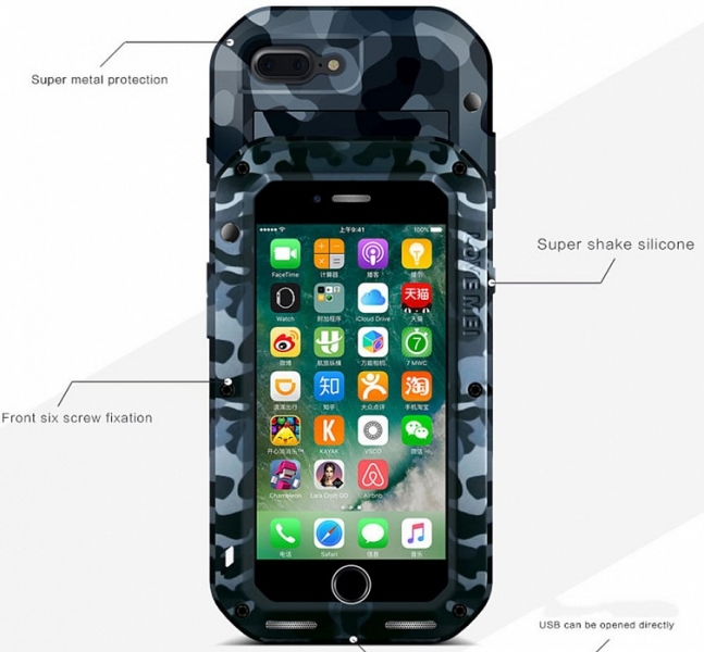 Love Mei Camo Series — это противоударный пылезащищенный чехол для iPhone 7. С ним ваш смартфон будет максимально защищен от любых непредвиденных ситуаций. Чехол состоит из таких частей, как передний бампер, противоударное стекло, задняя подкладка, задняя крышка и задний бампер. Все это закрепляется с помощью 6 винтов и гарантирует непревзойденную защиту смартфона от последствий падений, сколов, царапин, пыли и брызг.