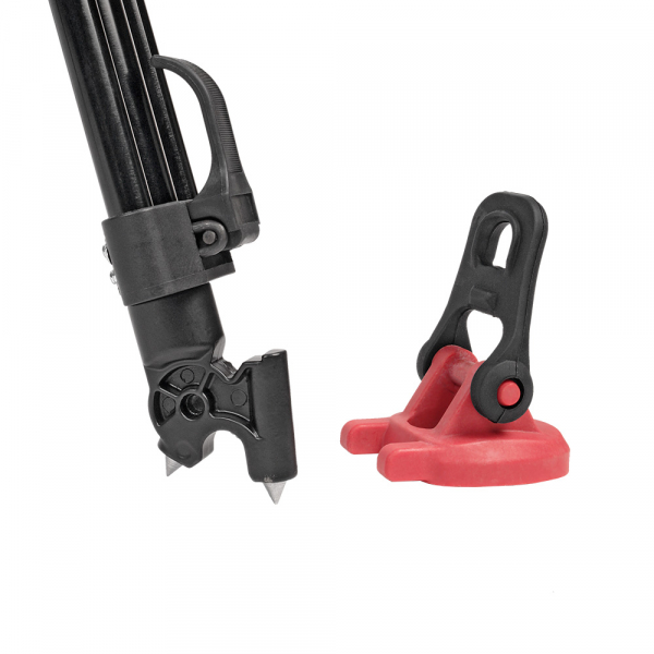 На концах штативных ног размещены парные шипы, на которые надеваются резиновые "башмаки". Таким образом, можно выбрать необходимый тип опоры для различных условий съемки.