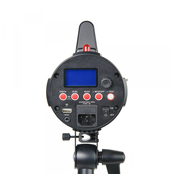 На панели находятся кнопки управления режимами работы моноблока, ЖК экран с яркой и контрастной подсветкой, выключатель, колёсико выбора («крутилка»), USB порт для подключения приёмника, гнездо для 3.5 мм джека кабеля проводной синхронизации, гнездо для подключения питания и гнездо для предохранителя 5А. На верхней части корпуса находится датчик светосинхронизации. Алюминиевый корпус обеспечивает хорошую прочность моноблока. Стальной кронштейн надежно фиксирует моноблок на стойке. В кронштейне предусмотрено отверстие для установки зонта. Система охлаждения вентилятором не даст устройству перегреться при продолжительной работе.